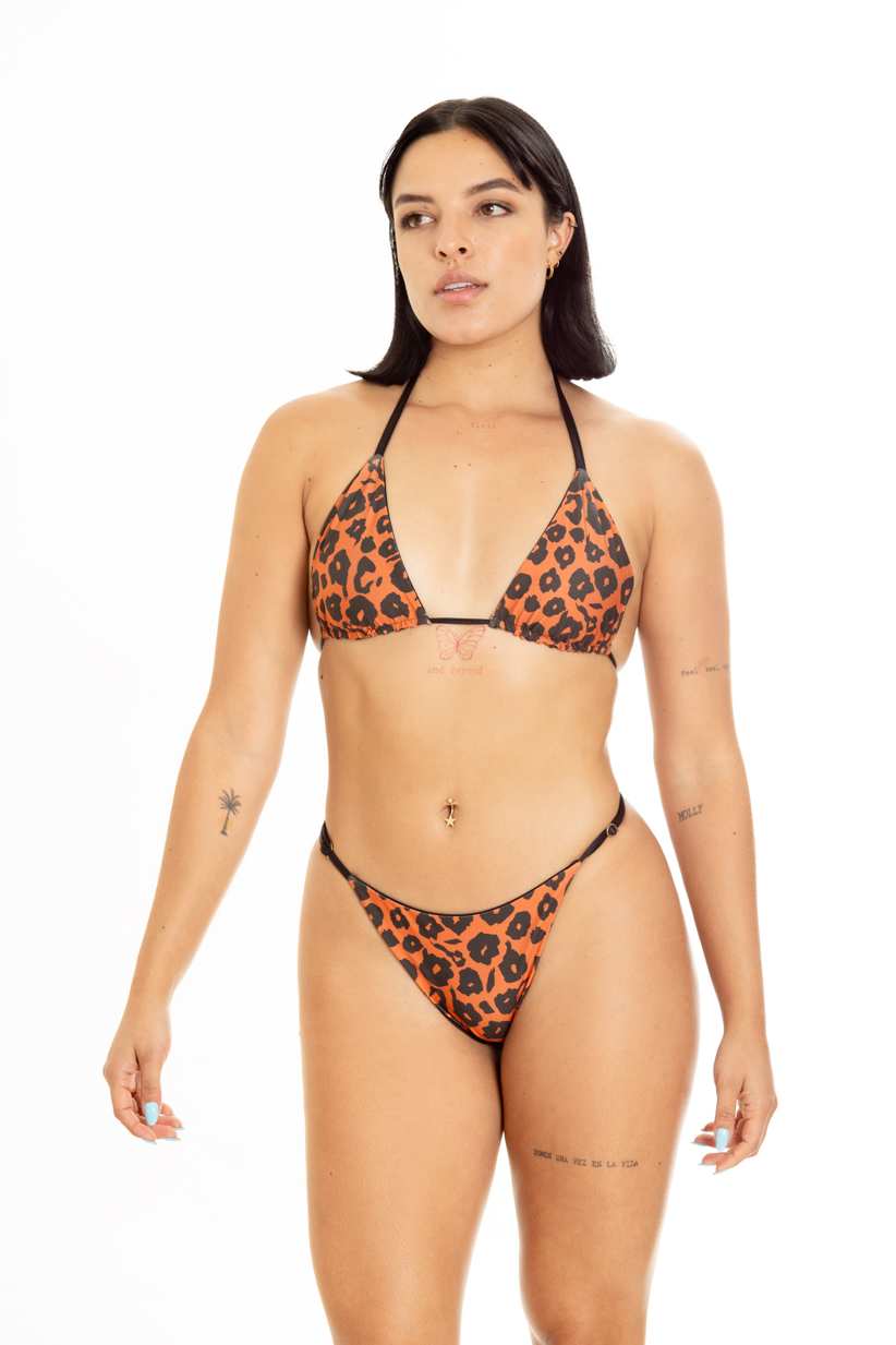 Bikini doble faz fabricado en Colombia con tela italiana y tela nacional PET (material plástico recuperado), con herrajes dorados resistentes al agua.